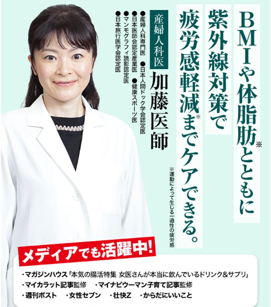 激しい運動が難しい私でも脂肪を落とせるなんて目からウロコです。さらに、お肌を紫外線から保護してくれる効果まであってとても嬉しいです。しかも創業75年を超えるあの明治薬品が製造しているのも安心感があります。